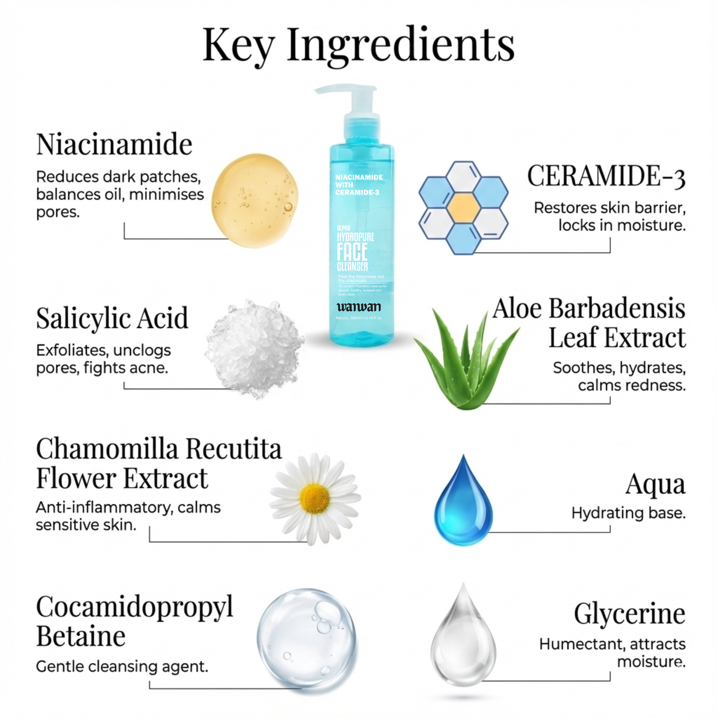 Experience a new level of clean with Wanwan Alpha Hydropure Face Cleanser, a gentle yet effective formula designed to purify, hydrate, and rebalance your skin in every wash. Infused with the power of Niacinamide and Ceramide-3, this advanced cleanser works deep within the pores to remove dirt, excess oil, and daily impurities while protecting your skin’s natural moisture barrier.